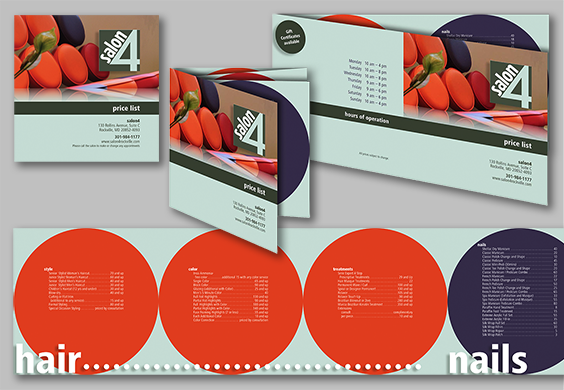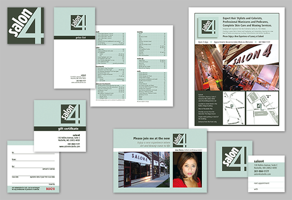 Salon4 Identity—Logo, Business Cards, Price List, Gift Certificates, Direct Mail Postcard, Flyer & Map